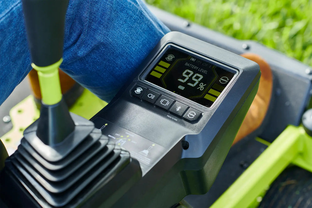 - LCD screen and control panel to monitor runtime, battery life, cut speed, drive speed, on/off headlights and pair with the RYOBI riding mower app via bluetooth