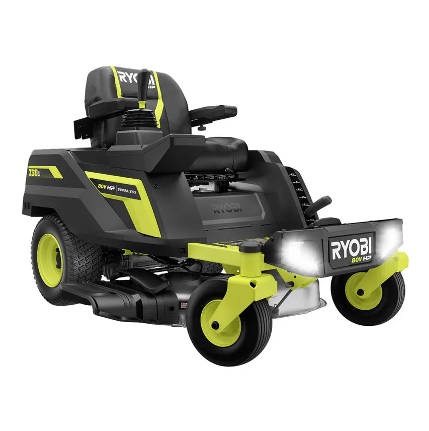 Introducing RYOBI’s first lithium-ion battery powered zero turn riding mower, the RYOBI 80V HP Brushless 30″ Lithium Electric ZTR.* HP Technology and 80V batteries combine to deliver the power equivalent of a 28 horsepower gas engine*, while eliminating the hassle and maintenance of a gas mower. This rider cuts up to 1 acre per charge with the help of 4 brushless motors and (2) 80V 10Ah batteries, with a Super Charger that fully recharges in 1.5 hours so you’re ready for your next job. The revolutionary iDrive system uses an intuitive one-handed joystick steering to maneuver around objects more easily than a traditional ZTR. The innovative LCD screen displays runtime, battery life, and more, while the Riding Mower app allows you to monitor charge time and battery life remotely. The 12-point height adjustment allows you to select the perfect cutting height between 1.5″ and 4.5″. This mower continues to lead innovation with the compatible Bagger Boost accessory, which quickly clears the chute with the press of a button. The 30″ deck and rubber side discharge chute allow this rider to fit through a standard 36″ gate, and makes it easy to maneuver around landscaping. Designed with comfort and convenience in mind, this mower features a premium seat, a USB port to charge phones, a storage compartment, and LED headlights. Lawn maintenance will never be the same thanks to the RYOBI 80V HP Brushless 30″ Lithium Electric Zero Turn Riding Mower.